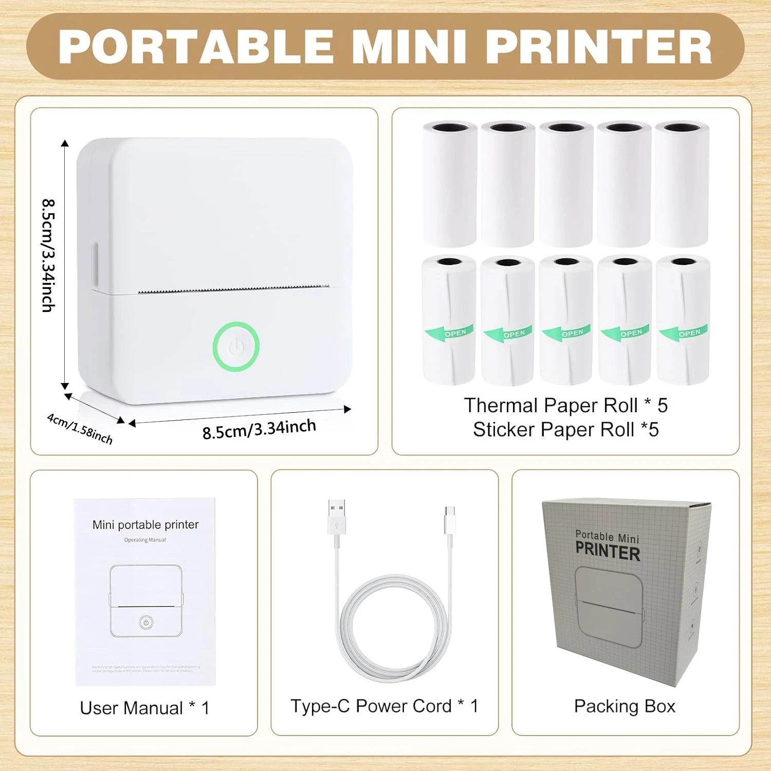 Livré avec 5 rouleaux d’autocollants et 5 rouleaux de papier thermique, offrant une variété d’options d’impression.