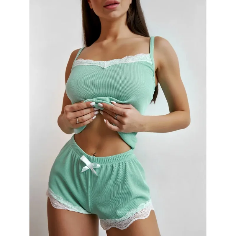 Pyjamas pour femmes européennes et américaines avec dentelle et décorations en dentelle, bretelles spaghetti, ensemble de shorts de nuit, vêtements décontractés pour la maison