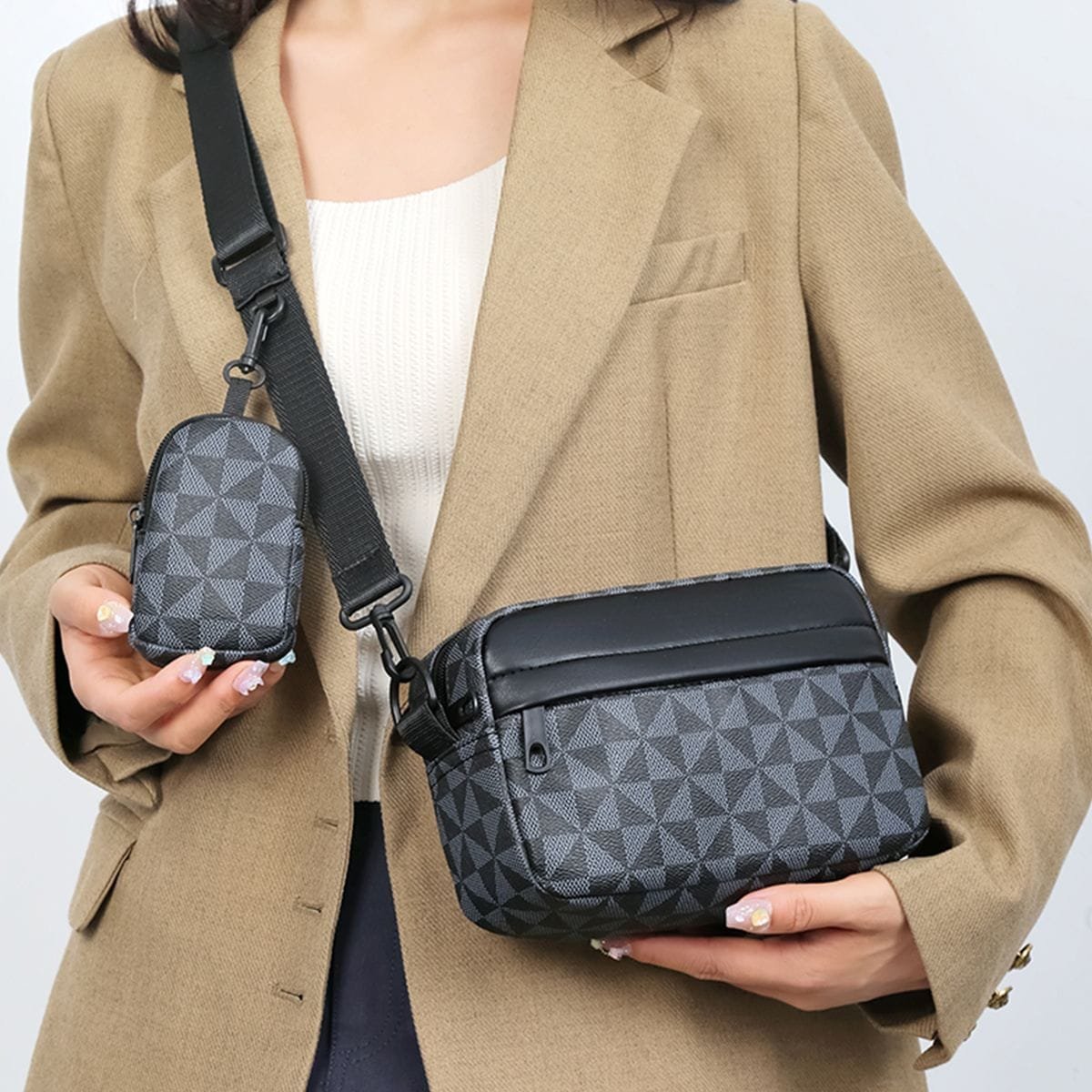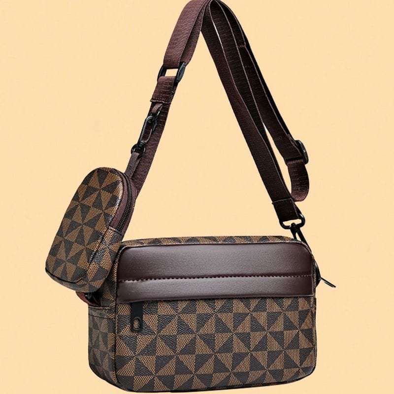 Style : Ce sac bandoulière arbore un motif géométrique marron et noir tendance, parfait pour un look décontracté et moderne.